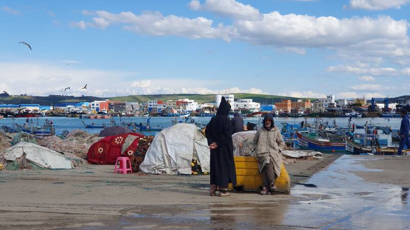 We nemen een taxi downtown naar de vissershaven zo'n 5 km verderop voor een belachelijke 10MAD (€0,90), daar kun je niet voor lopen. De haven krioelt van het volk en is een festijn voor het oog ; overal stapels netten met vissers die aan het boeten zijn, uitgestalde verse vis op kleedjes, enfin een aangename drukte van belang.