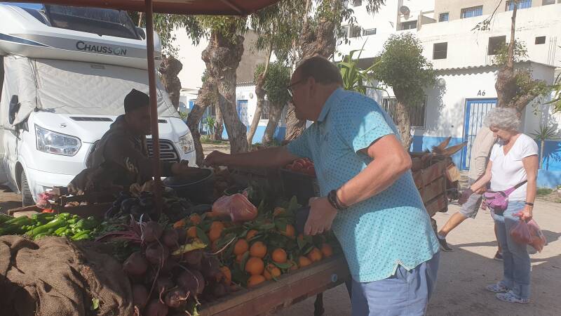 No picture, no picture, gebaart de vrouw driftig sticulerend naar Marjos, die met een onschuldig gezicht rondloopt met haar mobiel. 'Ze zijn niet gek hier' lispelt mijn eega, 'ik heb inderdaad stiekem wat foto's genomen' gniffelt ze. We lopen op een groentesouk, één van de vele, op de kustweg niet ver Tanger Med. Het is druk, veel volk wat van alles en nog wat inslaat. Wij kopen wat munt, doperwten, aardappels, sinaasappels en overheerlijke aardbeien.