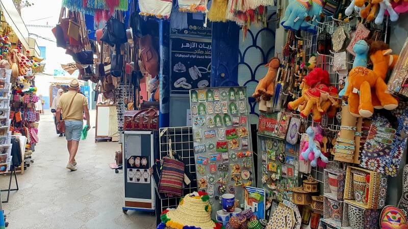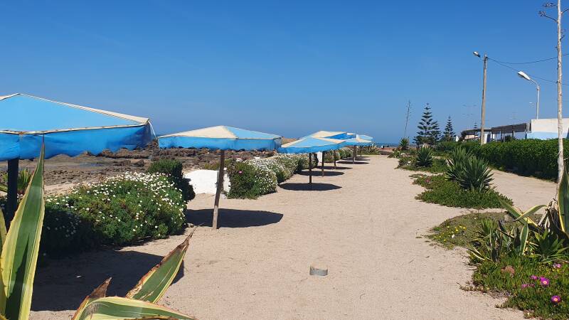 Op camping Echrigui vinden we een mooi plekje in de zon. Om de snel modderige plekken te bestrijden is overal een ruime laag steenslag aangebracht, fijn. We lopen langs zee naar de oude Medina en doen daar wat laatste souvenir inkoopjes. Op de terassen van de restaurants bij de Medina is het druk. Mensen (lees toeristen) zitten uitgebreid te lunchen en er wordt zelfs wijn en bier geserveerd!