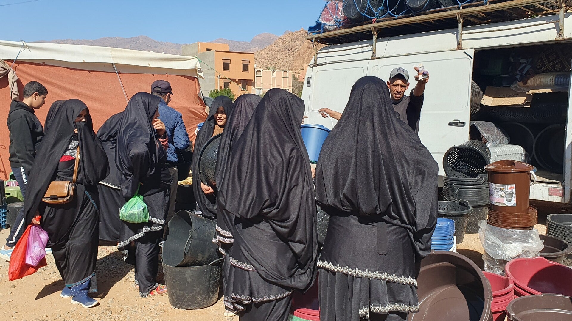 Het laatste stuk van de markt doet in kleding en huishoudelijk spul. Een marktkoopman zwaait vervaarlijk met een grote plastic teil en smakt deze met geweld tegen de grond. Ook een wasmand ondergaat eenzelfde behandeling. De man voorziet de demonstratie met wervende en luide oneliners die de verkoop moeten opstuwen. Triomfantelijk wordt erop gewezen dat de impact niet tot beschadigingen of scheuren heeft geleid. Dat helpt. Velen van de toegestroomde in het zwart geklede vrouwen kunnen de verleiding niet weerstaan. Zij zijn voldoende onder de indruk om tot aankoop over te gaan. En aldus het straatbeeld te wijzigen, overal lopen ze rond op de markt met hun nieuw verworven huishoudelijk plastic geluk.