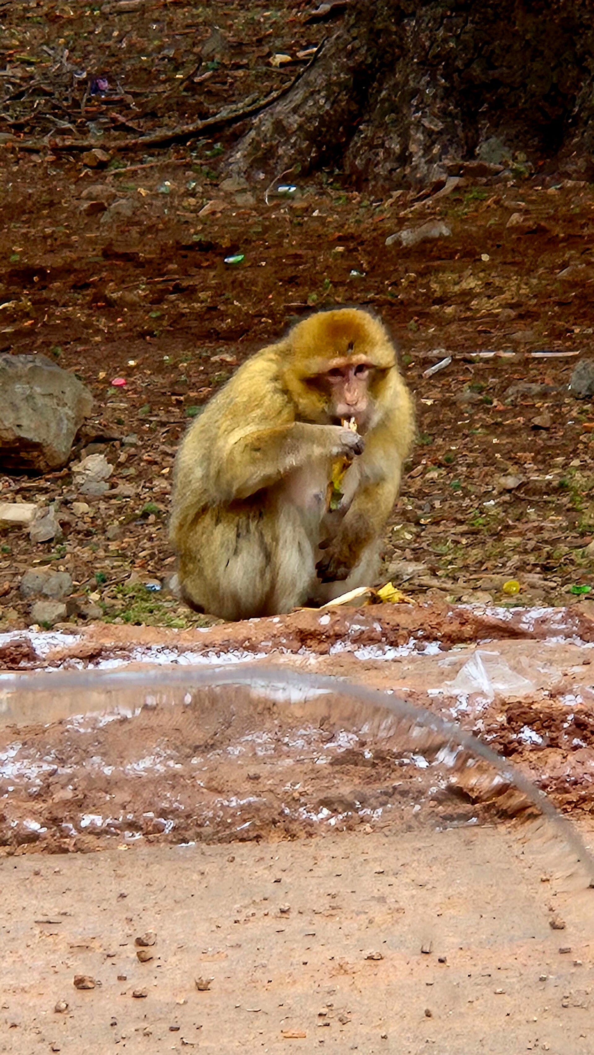 Eenmaal boven in het cederwoud zijn de eerste opstoppingen met auto's bij plekken waar de Berberapen zich graag laten voeren door de vrolijke meute. Ook wij strooien met wat banaan in het rond die met graagte door de apen worden opgepeuzeld. Na passage van de sleehellingen wordt de hoeveelheid sneeuw echt serieus. Verkeersborden aan de zijkant van de weg zijn veelal verborgen onder dikke weggeschoven sneeuw.