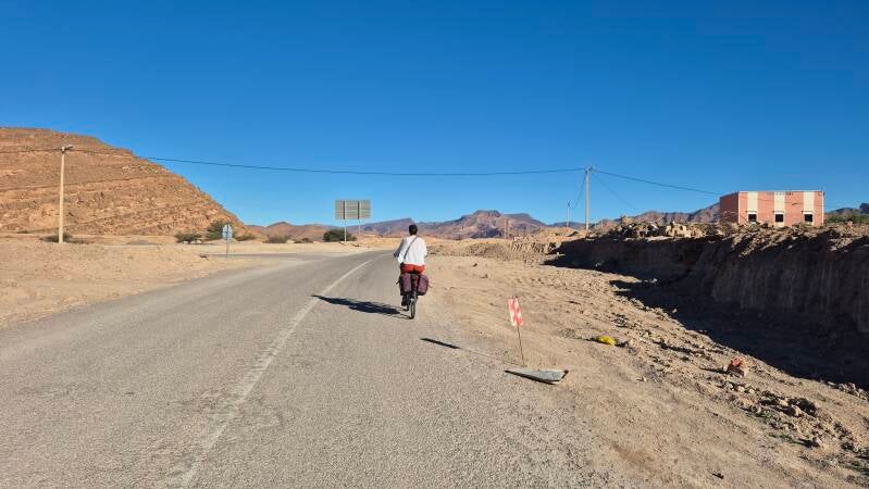 In de oase stroomt in goten het door het Horloge gedistribueerde water en in de lemen dorpjes worden vrachtwagentjes ontladen van hun geplukte dierenvoer. Fietsend krijg je ook een mooi inzicht in de gelaagdheid, etagebouw van deze piséhuizen, waar 'ondergrondse' corridors de zomerse hitte opvangen. Het Horloge-gebouwtje is niet open, ik vraag mij af of de waterverdeling nog steeds van hieruit wordt geregeld. Voor uitleg van de waterklok zie ons eerder verslag Deel 6 - Voorjaar 2024 - 27 februari. Natuurlijk wel met pal ernaast zicht op de kanaal verdeling van het inkomende water. We fietsen via het grotere lemen dorp Tighrmet weer terug naar de N7, overigens onder vrolijk meegeloop van talloze kinderen. De hoofdweg brengt ons weer snel terug naar de camper.