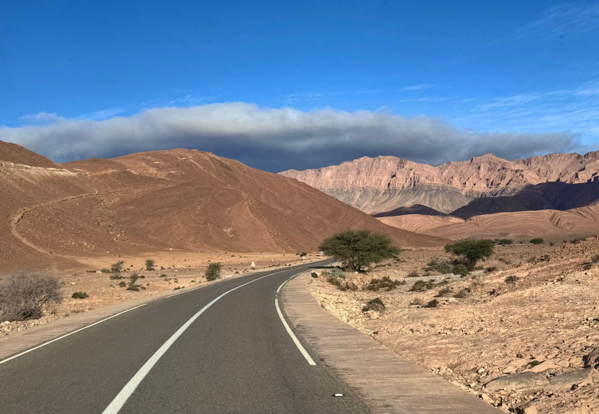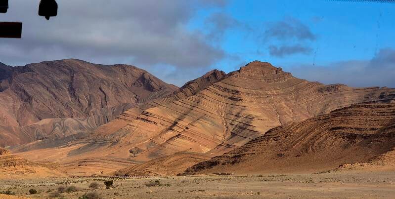De vruchtbare Souss Massavlakte verruilen we voor de Anti Atlas die naarmate we vorderen steeds droger wordt. Opvallend is dit keer dat de wolken met ons meereizen naar het zuiden, wel meer en meer in flarden. Ook wel fijn want we hebben de rijrichting tegen de zon in en die wordt nu wat getemperd. Het komt ons zicht op en contrast in het landschap ten goede.