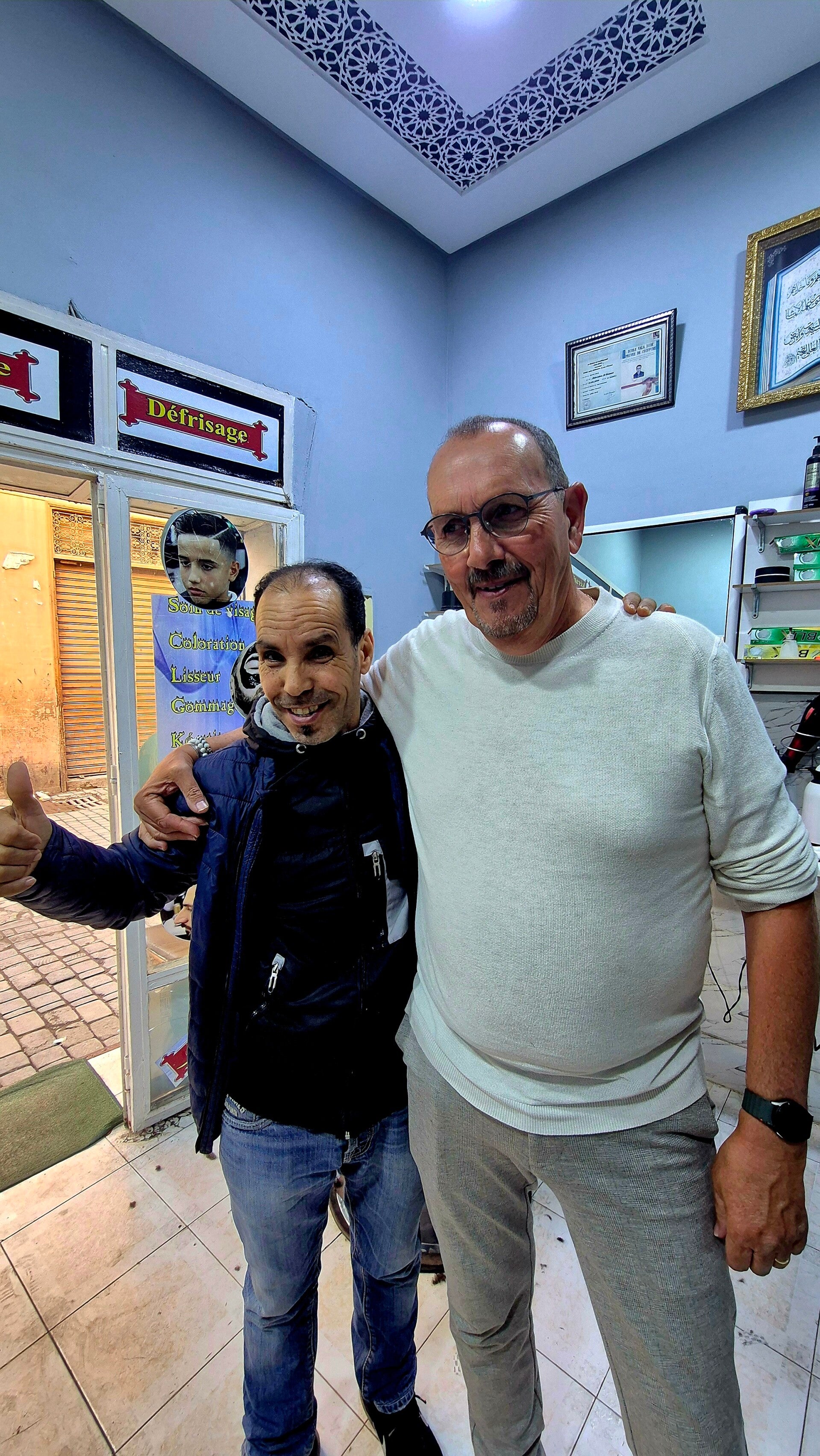 Dan maar in de straat een kapper opgezocht voor mijn haardos. De vaardig door barbier Omar gehanteerde tondeuse fatsoeneert mijn coupe weer naar beter niveau en tevens wordt mijn baardje kundig bijgewerkt tot een gesoigneerd geheel. De souk is nog steeds in de sferen van het middaggebed. Wel tref ik Milood de tassenman en ik laat hem zien dat de gerareerde riem aan de korte kant is. Hij gaat er onmiddelijk mee aan de slag belooft hij.