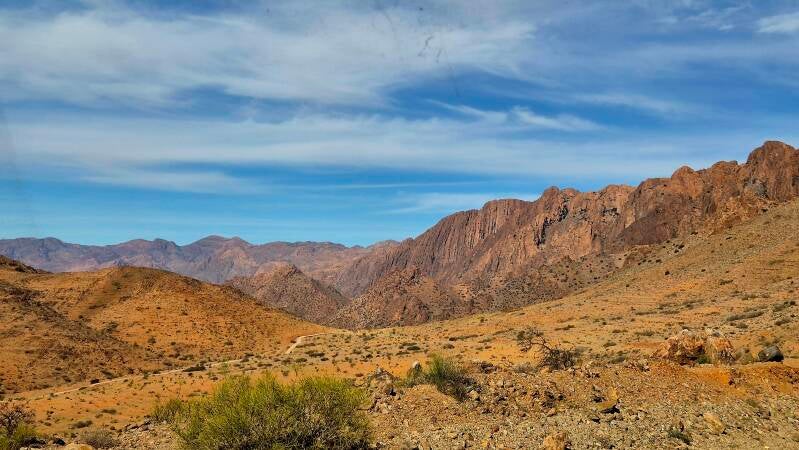 Het is stralend weer en vrijwel windstil en dat rijdt heel wat prettiger. Nu pedaleren we in een heerlijk tempo noordwaarts op de P1805 bezijden de steenvlakte richting bergen.
