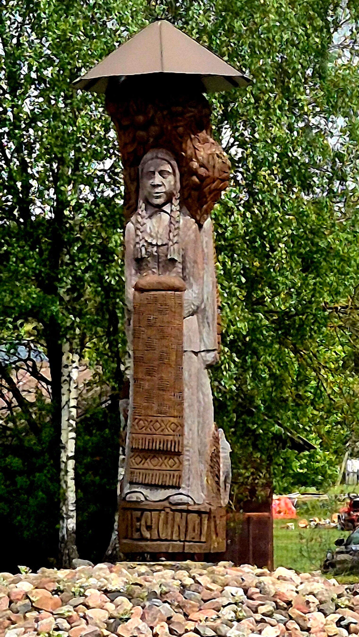 In een eerste dorpje wat we passeren maken we een korte fotostop voor de typische meer dan manshoge houten beelden op een plein. Overigens zullen we dit soort houtsnijkunst vandaag overal tegenkomen.