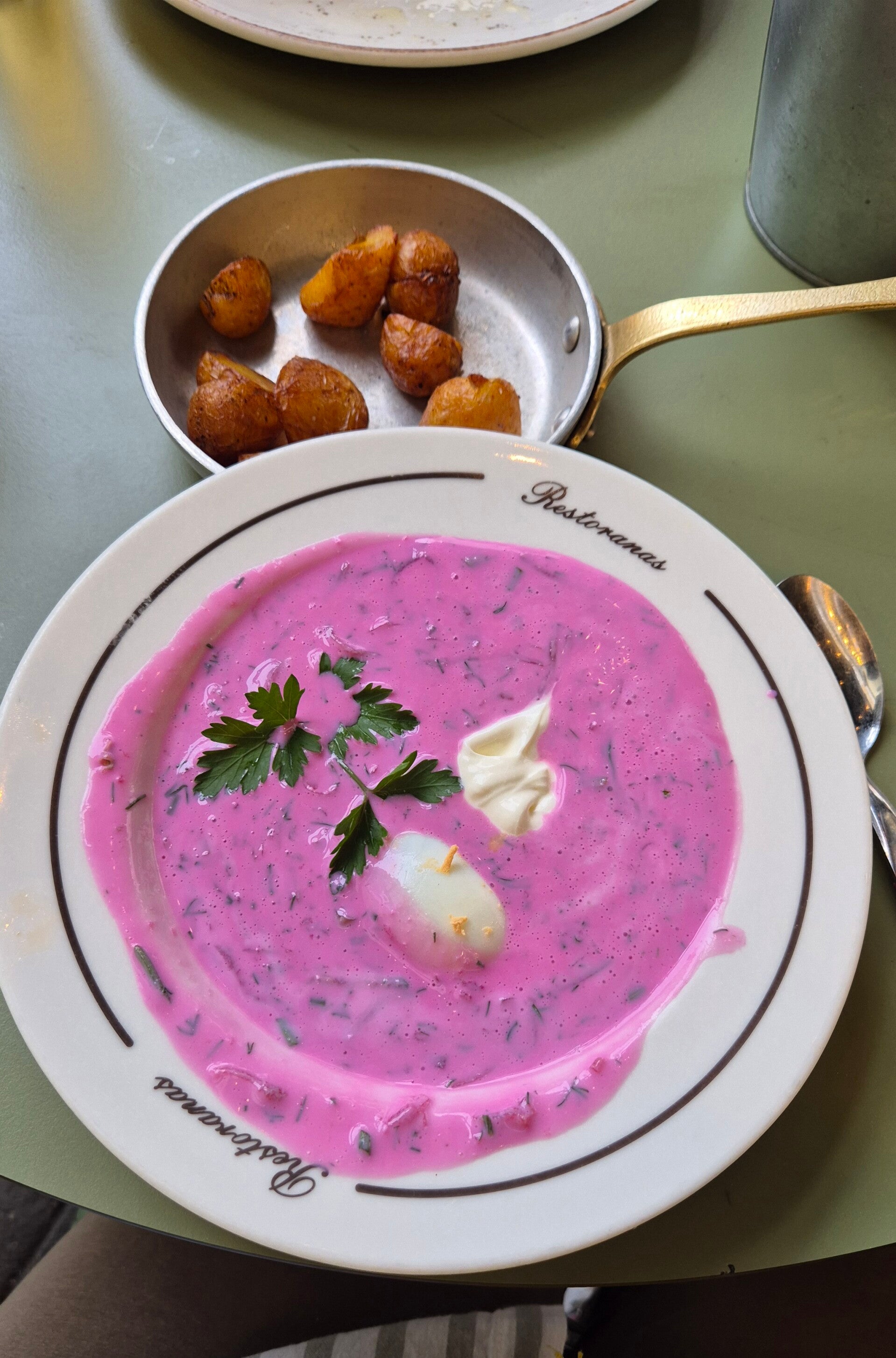 Rechtsomkeert en heuveltje-af, het glooit kalmpjes neerwaarts 🙂, zetten we ons bijna vooraan op de Pilies, neer op het terras van een restaurant die Litouwse gerechten serveert. We delen zalige koude bietensoep en een gerecht met aardappelpannekoekjes, zalm, zure room, dille en paddestoelen, heerlijk 😋.