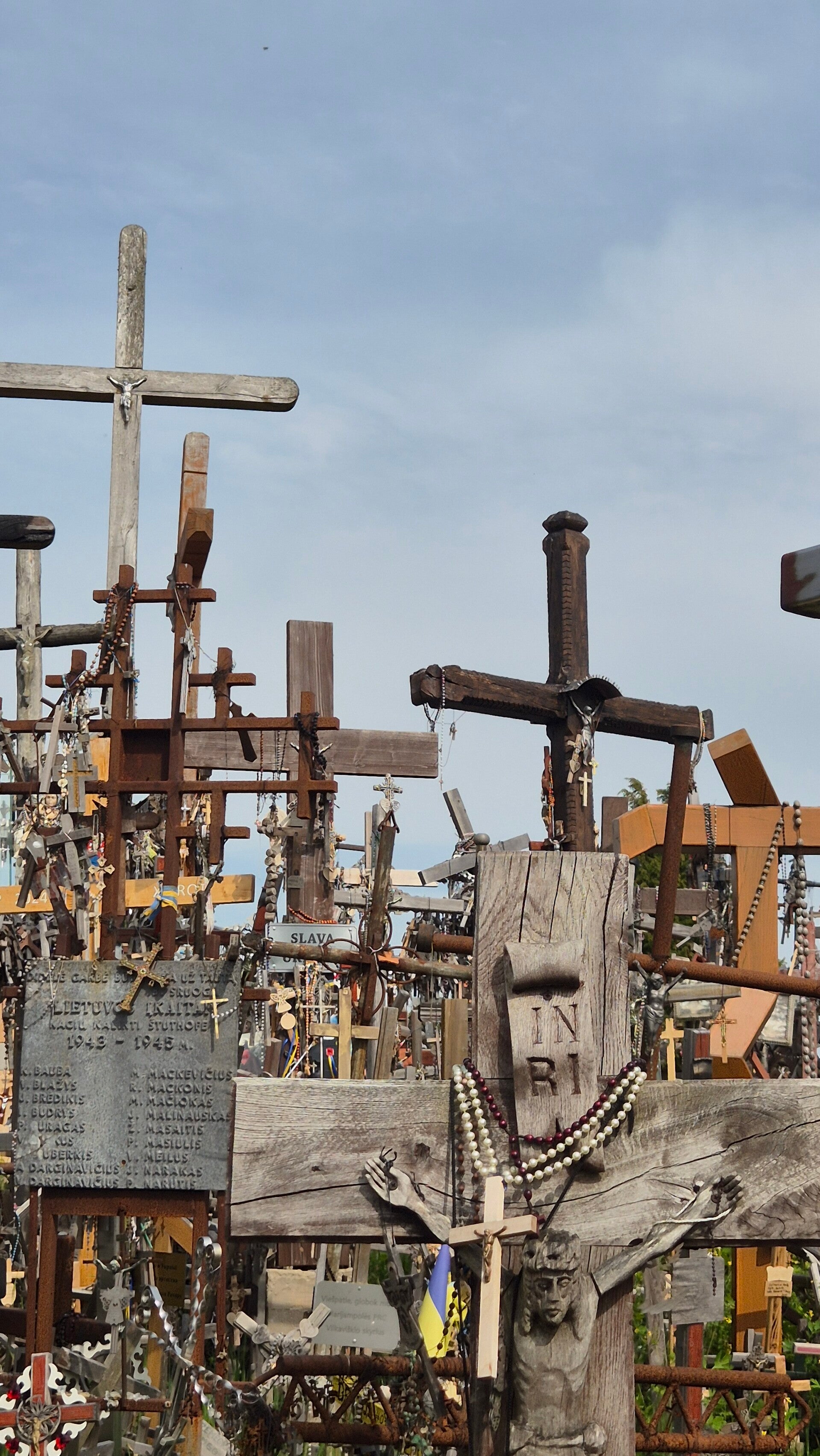 Zeven kilometer na Siauliai zetten we de camper neer op een vlak parkeerterein van de Heuvel van Kruisen, die een paar honderd meter verder ligt. Net als de andere toeristen vergapen we ons aan het indrukwekkende tafereel. Al tweehonderd jaar is de plek waar ooit het heuvelfort Jurgaiciai stond een bedevaartsoord voor Litouwse katholieken en plaatsten ze hier kruisen. In de loop van de tijd kwamen daar ook wat beelden van de maagd Maria bij en rozenkransen. Tijdens de Sovjetbezetting stroomden mensen massaal naar de heuvel om een eerbetoon (kruis) achter te laten, waarmee ze trouw toonden aan hun nationale identiteit, religie, cultuur en erfgoed.