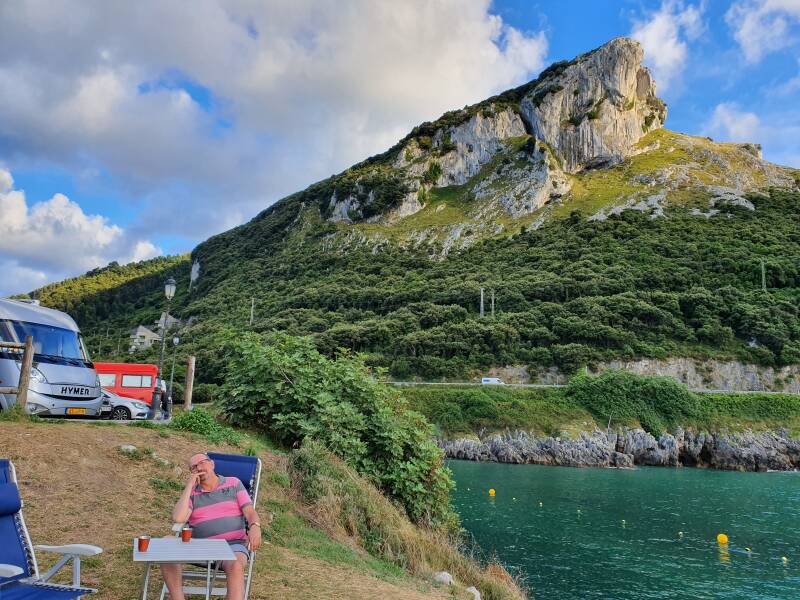 Voldaan terug naar de camper gescooterd en weer onderweg, afwisselend op de kustweg en de A8. Prachtige Ria-kust, vaak met mooie intieme baaitjes en strandjes en dan weer heuvels, uitlopers van het Picos-gebergte. Halverwege de middag arriveren we in Ribadesella. We doen een poging om vlakbij de brug te parkeren, om een foto te maken van de geraamten van oude (roei)boten, die in de drooggevallen modder (eb) van de Ria (zee-inham) liggen, een apart beeld, maar dat parkeren lukt niet. Voordat we het weten rijden we het stadje al weer uit, stapvoets. Een fietser passeert ons, het is Harry en die legt ons snel uit, waar zij hun bivak hebben opgeslagen. Zij hebben hun camper geparkeerd net buiten Ribadesella bij een sportschool, tegenover de ingang van de prehistorische grotten. Die aanwijzingen volgend, vinden we hun camper en parkeren de onze ernaast, mooie stek! Tafeltje en stoelen eruit, wijntje erbij met uitzicht op de voor ons gelegen en nog steeds eb-droge Ria. We kletsen over van alles en nog wat, als we worden onderbroken door twee politie-agenten. Zij vertellen ons dat we hier niet mogen overnachten en ook niet (buitenzittend) campinggedrag mogen vertonen en wandelen weer weg. Onderling bespreken we kort, dat hier niet mogen staan middels verbodsborden moet worden aangegeven, daar is geen sprake van en dat voorts het niet mogen vertonen van campinggedrag tussen vele picknick-ende mensen om ons heen, onzinnig is. Harry hobbelt achter de politiemensen aan en weet hen te overtuigen. We mogen overnachten en buiten blijven zitten, mits we er geen rotzooitje van maken. Geanimeerd zetten we ons gesprek buiten voort, reuzegezellig. Later op het eind van de middag, gaat het wat spetteren en zetten we de borrelgesprekken voort in onze camper. 's Avonds komen de twee agenten nog even kijken hoe alles is en zwaaiden ons vriendelijk toe.