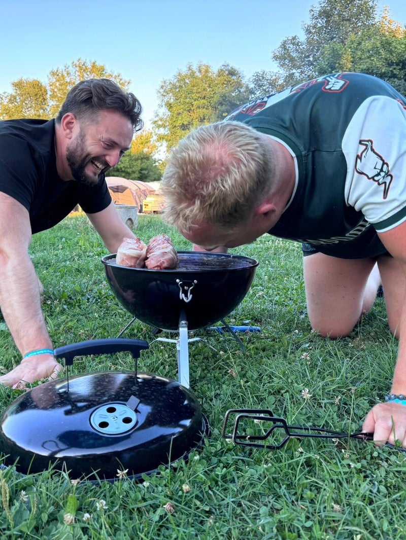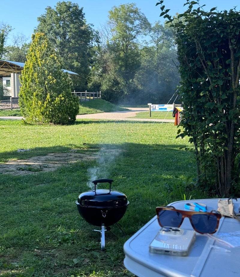 Later op de ochtend laten Jeroen en Michelle zich stroomafwaarts zakken in de opblaaskano van Bram en Marleen, wij houden een oogje op de kids. Na een stief uurtje geeft een pling op de mobiel aan dat ze het afstappunt naderen en opgehaald willen worden. Ik sjees met de Lynk er naartoe en pik ze op. 's Middags, na een niet verkoelende plons in het veel te volle zwembad, is het tijd om op onze nieuwe plek het gezamelijk etentje voor te gaan bereiden. Als alles is aangeschoven en gesprekken volop op gang zijn gekomen starten we het kookfestijn op.