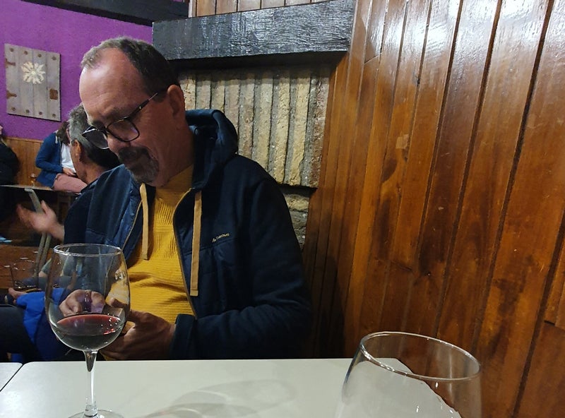 In een pelgrims-hostal, waar het een drukte van belang is, drinken we een lekker Navarees rood wijntje. Morgen hier maar even verder rondneuzen in dit historische plaatsje.