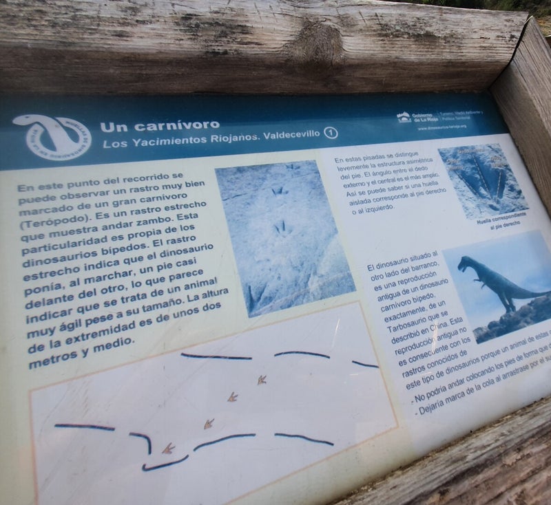 We rijden over een heerlijke kleine bergroute en genieten van de mooie beboste omgeving. Tien kilometer verderop in het plaatsje Enciso nemen we een kort stukje van de Dinosaurus-route. In het hele gebied zijn niet alleen fossielen gevonden van diverse dinosaurussen, maar ook voetsporen. De meest duidelijke sporen bevinden zich hier op 2 km van Enciso op een vrij toegankelijke plek. Onder een afdak vinden we de afdrukken van een grote carnivoor, ze zijn prachtig geconserveerd.