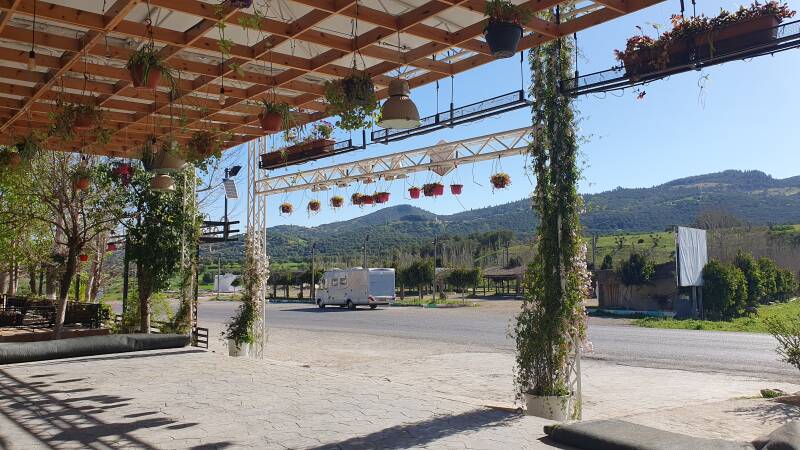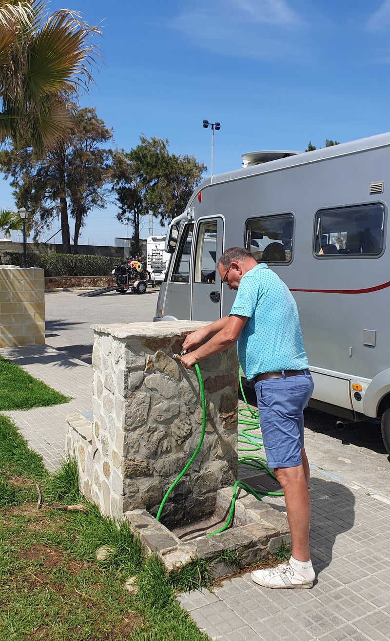 Na 30 kilometer rijden over slecht wegdek, veel bochten en drempels, zodat alles goed heen en weer klotst, arriveren we bij een mooie CP (Facinas N36.15027 W5.707338). Hier lozen we de schuimende verswatertank en maken meteen buiten- en binnendop schoon. Prettige bijkomstigheid is de zeer hoge waterdruk vanuit de kraan, dus we kunnen goed doorspoelen. We herhalen de vulprocedure en gaan weer op pad. We rijden een hobbel-de-bobbel rondje van 25 kilometer, gaan terug naar de laatste CP en spuiten weer alles door.