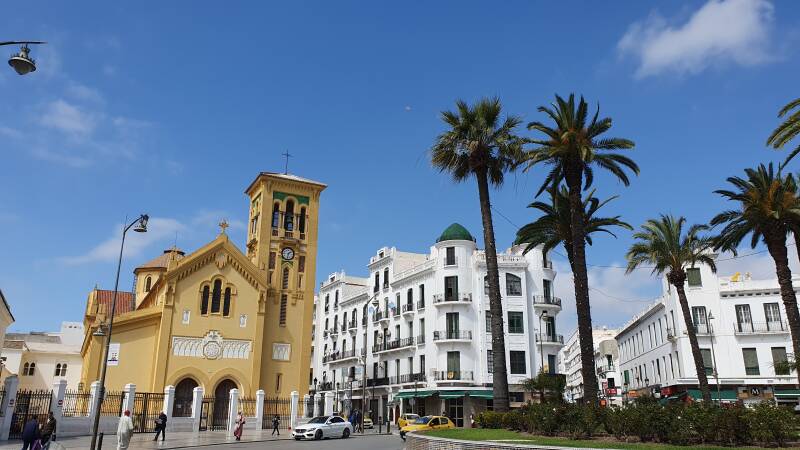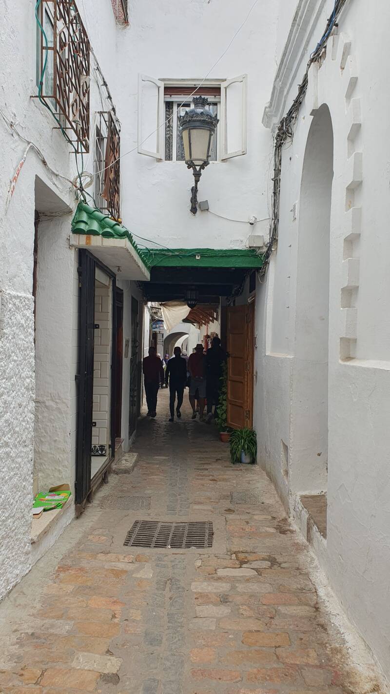 Tetouan heeft ondermeer een Spaans koloniaal verleden en de invloed daarvan is aan straten en bouwstijl af te lezen. Brede avenue's met mooie mediterrane uitstraling voeren naar het centrum. We worden afgezet op een plein en lopen door een brede schone winkelstraat, waar grote fraaie panden met zwierige balkons staan, richting souk. De Spaanse connectie is ook merkbaar als we informatie aan omstanders vragen. Die schakelen meteen om naar Spaans, want Frans beheersen ze niet of nauwelijks. We vinden het een mooie stad met een eigen levendige vibe. Mensen zien er over het algemeen verzorgd uit. Met name veel jongeren zijn westers gekleed. Uiteraard lopen er ook nog veel mensen in traditionele kledij rond, zelfs vrouwen in nikab.