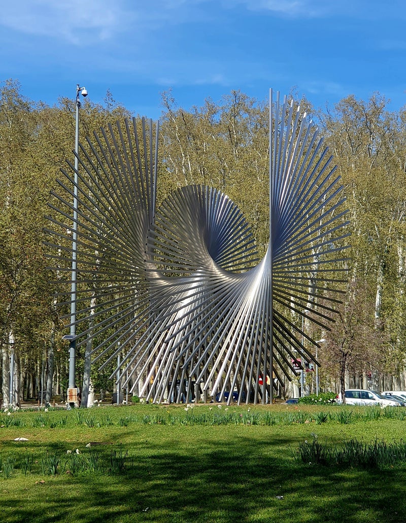 Groot kunstwerk op een rotonde, van alle kanten toont het anders