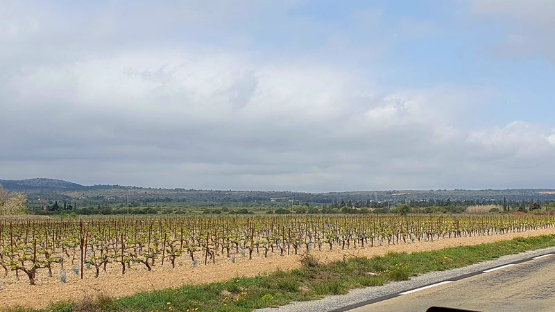 Bij Leucate draaien we van de kust af de wijngebieden van de Languedoc- Rousillon in. We zoeven kalmpjes voort over een best drukke binnenroute met veel verkeer. Komt het omdat het vrijdagmiddag is of mijden de mensen de Péage die hier vlakbij ligt. Enfin in ieder geval weinig vrachtverkeer en dat wel zo prettig. Soms is het wegdek in redelijk deplorabele staat en verandert ons zoeven in voorthobbelen en uiteraard zijn er talloze rotondes te nemen die onverbiddelijk invloed uitoefenen op de gemiddelde voortgangs-snelheid, maar soit alla. Dus volharden we in de navi-instelling ook al omdat bermen vol staan met veel kleurige wilde bloemetjes in een mooie groene omgeving.