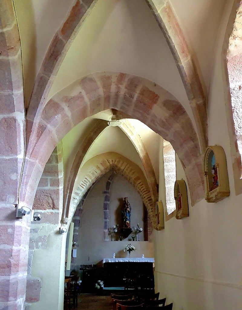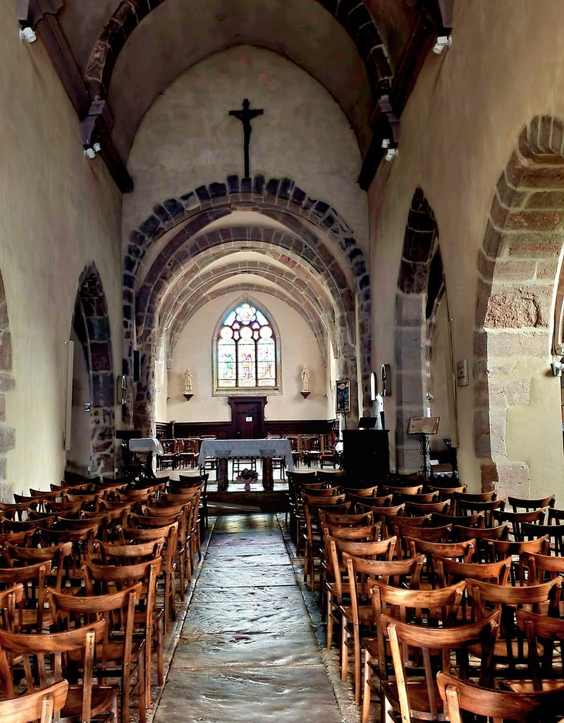 Het Romaanse schip binnenin is redelijk sober en donker door de kleine raampartijen.