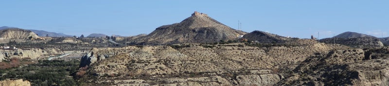 Prachtig uitzicht op de vroege morgen, na een koude nacht. Met enige moeite verlaten we de P en zetten koers naar een tankstation in de buurt waar we kunnen servicen. Na een cortado weer terug richting Desierto de Tabernas. Dit woestijngebied is in het verleden decor geweest voor vele westernfilms, zoals o.a. The good, the bad and the ugly, A fist full of dollars, maar ook Indiana Jones and the last crusade. Ook veel scènes uit bekende filmseries als The game of Thrones en Starwars zijn hier opgenomen. Op de afslag van de grote weg staat een cowboy te paard ons al op te wachten, want even verderop is ook nog een themapark gevestigd. De omgeving net voorbij het themapark is prachtig en vertoont inderdaad de filmische desert-look. In de diepte ontwaren we een heus Fort Bravo, wederom een plek voor de dagtourist. Er worden daar westernshows gegeven en dat slaan we over. Het 2 kilometer verderop gelegen plaatsje Tabernas, weliswaar naamgever van het gebied, stelt niet veel voor.