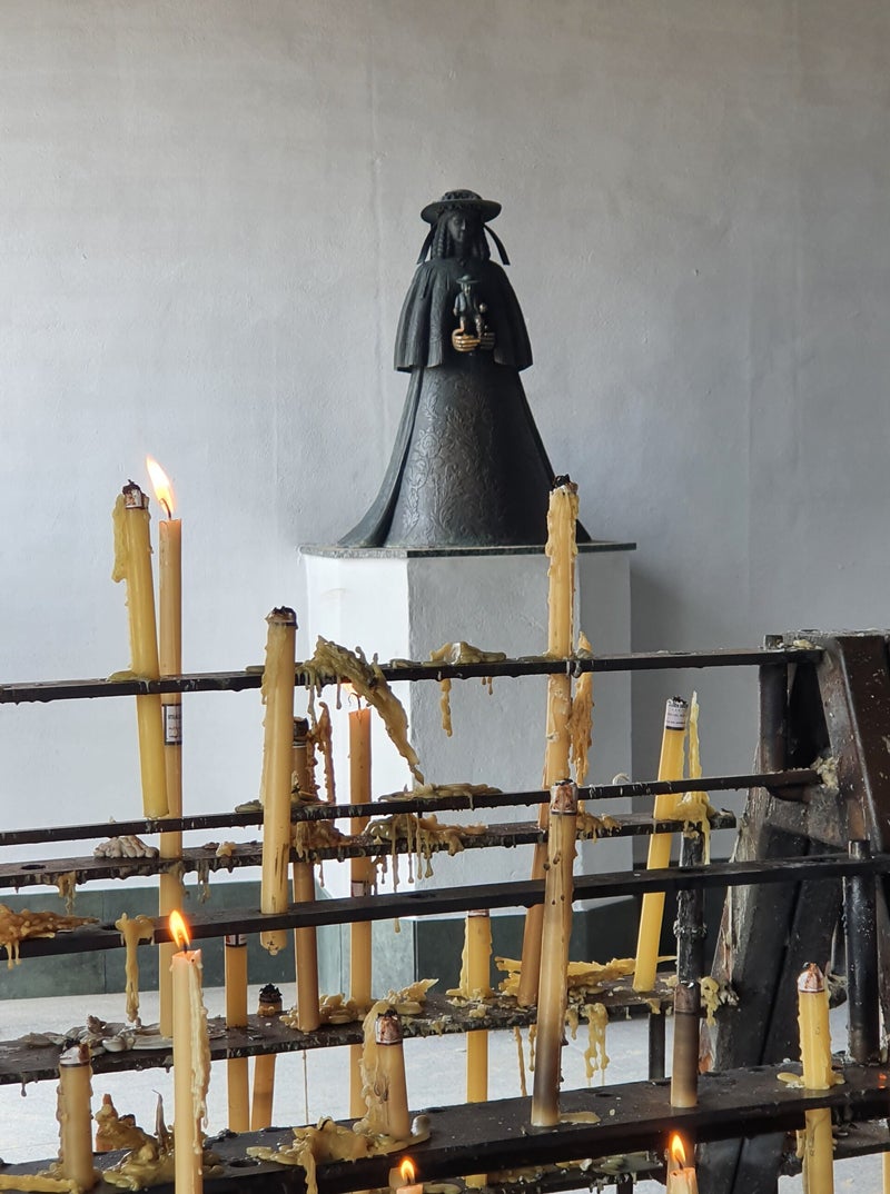 We stuiten ook nog op een direct aan de straat gelegen overdekte gebedsplek, waar mensen naar binnen lopen voor een kort gebed, wellicht voor een nodig wonder. Aan de muren hangen daartoe stille getuigen, zoals corsetten, beugels, krukken, lokken haar, blindenstokken, babyspulletjes om te onderstrepen dat gebeden soms worden verhoord.