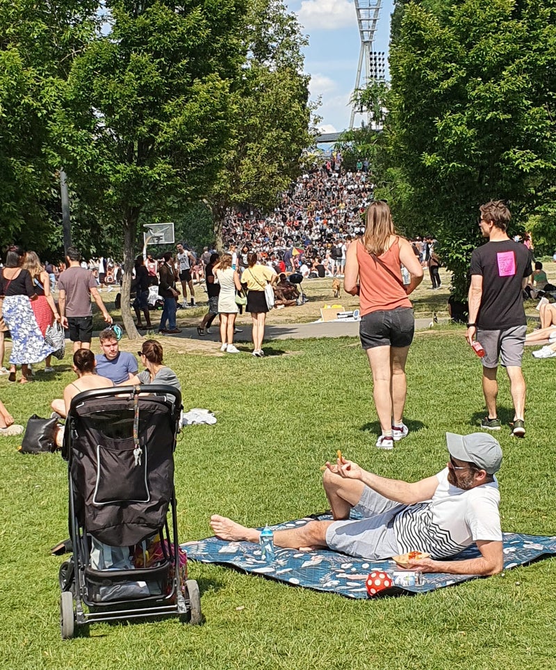 Tram en S-bahn voeren ons naar Tempelhof, het oude vliegveld uit de twintiger jaren van Berlijn. Het vliegveld is ondermeer bekend van de door Amerikanen na WO II ingestelde luchtbrug, die de bevoorrading van West-Berlijn op zich nam na blokkade van de SovjetUnie. Op het hoogtepunt landde hier elk minuut een vliegtuig met voorraad! Ofschoon nu niet meer in gebruik als vliegveld wordt het grote terrein nu gebruikt voor dagrecreatie door Berlijners, jong en oud. We lopen met de stroom mensen mee het terrein op, waar honderden mensen zich op talloze manieren vermaken. In de verte tegen de immens grote oude terminalgebouwen is een muziekfestival gaande. Op de oude landingsbanen zien we fietsers, skaters en skatesurfers. Er wordt gevliegerd, hardgelopen en aan yoga gedaan. Anderen kiezen ervoor gezeten op grasvelden alles aan te zien of ontsteken hun meegenomen barbecue voor een familie-etentje.