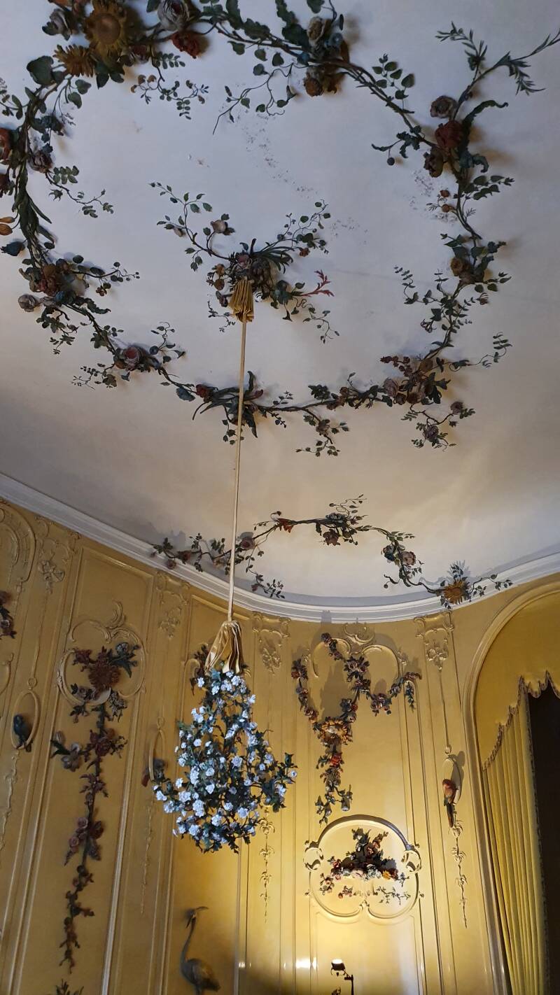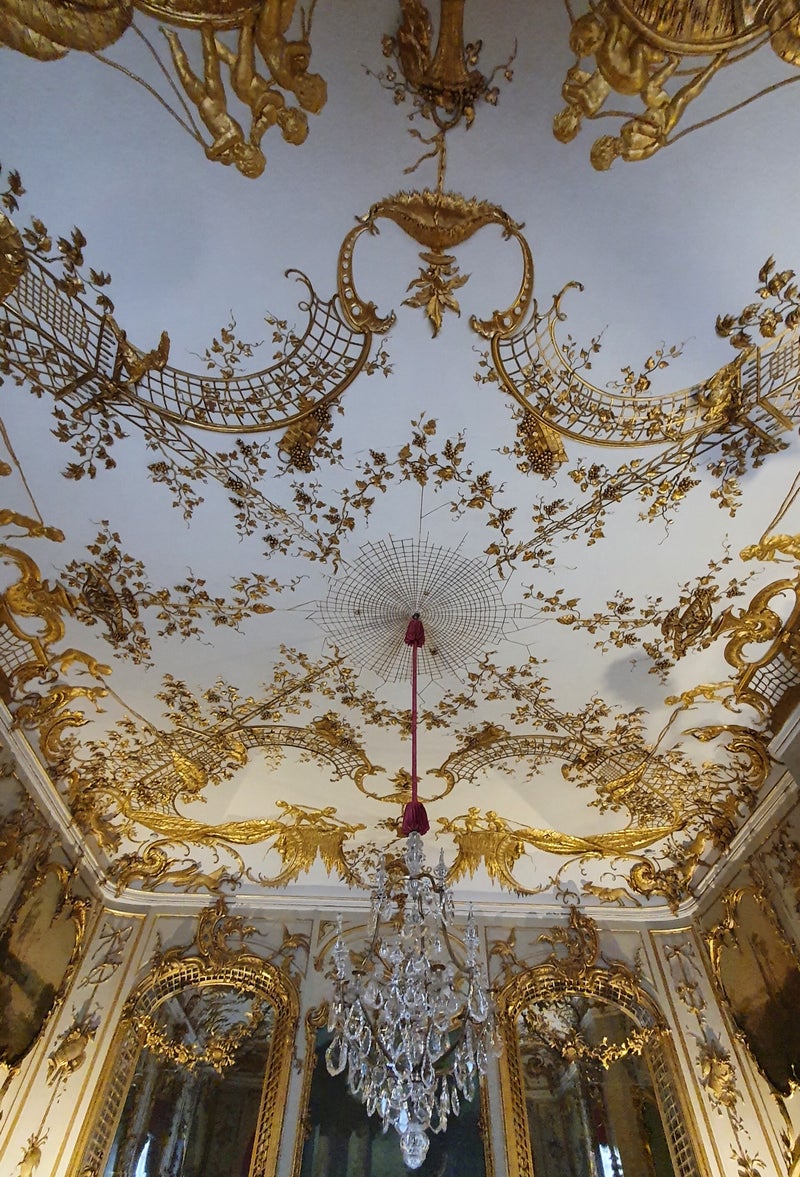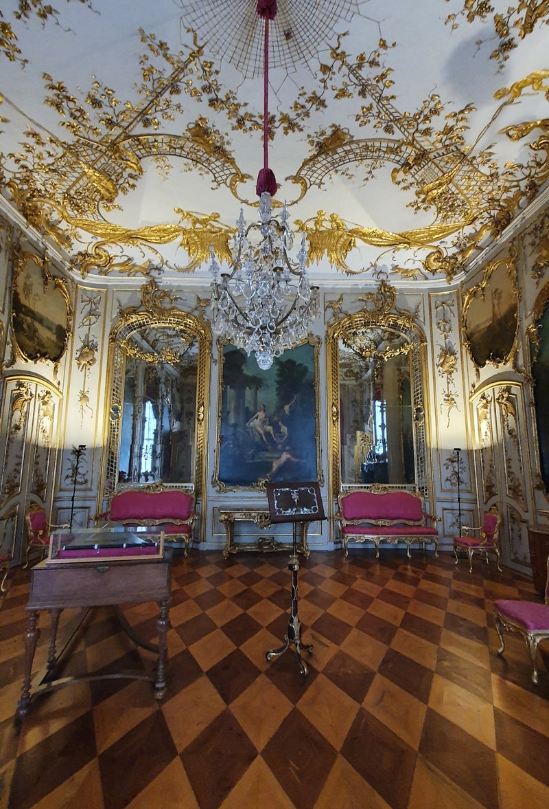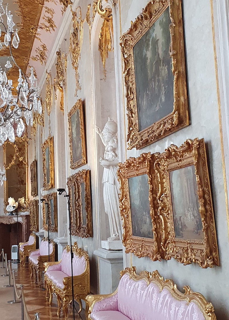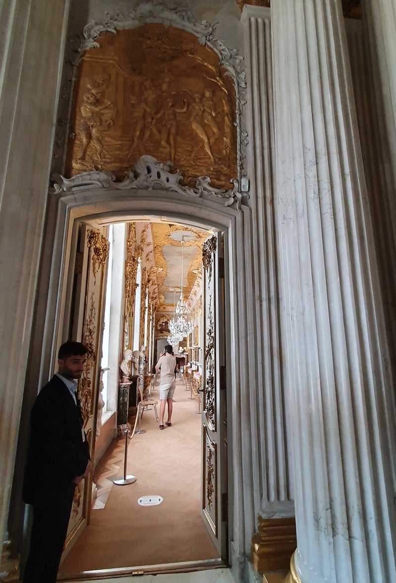 We kopen een kaartje en wandelen door het fraaie interieur, wat strikt volgens de richtlijnen van de vorst tot stand is gekomen, wat een pracht en praal. Overigens duidt de gebezigde naam Sans Souci, letterlijk Frans voor -zonder zorgen-, volgens deskundigen op het feit dat Frederik een hekel had aan kerken en religie, hij was 'zonder zorgen'.