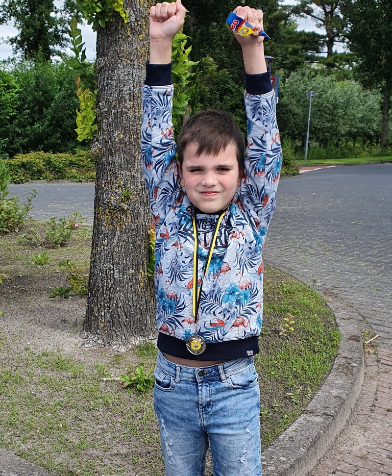 Trots showt hij zijn medaille voordat hij met paps en mams terugrijdt naar huis. Dat doen wij ook en in de middag arriveren wij op onze woonstek op het water. Wat een leuke trip was dit.