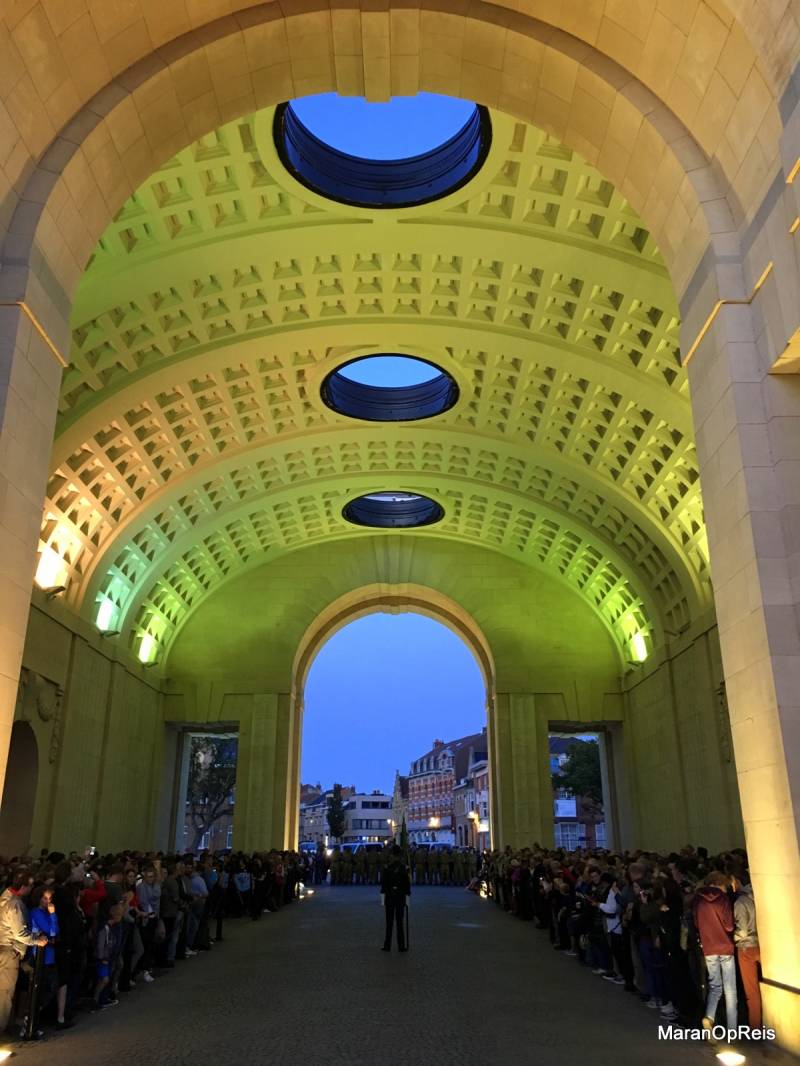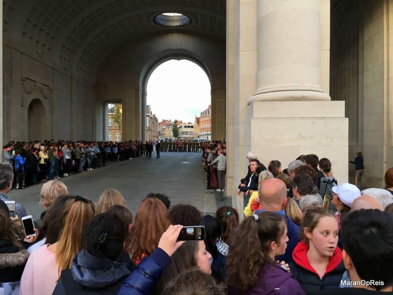 De Last Post in deze setting is toch iets wat iedereen die het hoort aangrijpt. Daarna worden vele kransen gelegd bij de wanden waarop de namen van de gesneuvelden worden vermeld en nemen familieleden de gelegenheid te baat om een zijden 'poppy' (klaproos) bij hun vermelde familielid te steken. De klaproos is het symbool van WOI geworden omdat de velden, ooit slagvelden waarop de oorlog woedde, vol staan met klaprozen en de vergankelijkheid symboliseren. In gedachte verzonken lopen we terug naar onze camper.