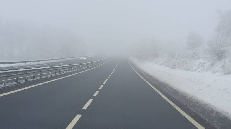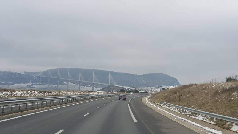 De brug bij Millau doemt op. Normaal spectaculair opvallend gelegen in deze omgeving, nu wat weggemoffeld in het mistige vale licht tegen een besneeuwde achtergrond. Naarmate de daling richting Mediterranee vordert, neemt de wind steeds verder toe.
