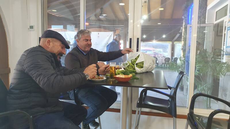 Na een paar uur lassen we een koffiestop in en belanden in Hostal El Perejil. Gezeten tussen de locals die veelal werkzaam zijn in de nabij gelegen Mar Plastico - groente en fruitteelt, is het genieten. Net als zij buffelen we de nodige stevige tapas naar binnen. Hierbij moet je denken aan minislakjes in een zalig jusje, aardappelsalade, gevulde en gebakken eitjes, njam njam, met aardappelen en groenten en gekruid gebakken stukjes varkensvlees in heerlijke jus. We begrijpen zonder verdere uitleg waarom zoveel volk is aangeschoven hier. De rekening is een volstrekt lachertje. Alles voor € 8,40, ongelooflijk. Hier heeft de energiecrisis geen inflatiesporen achtergelaten.