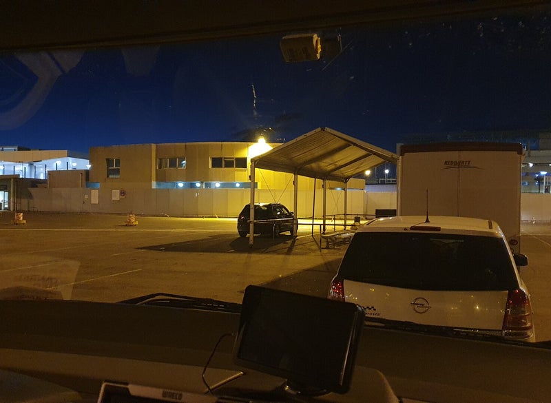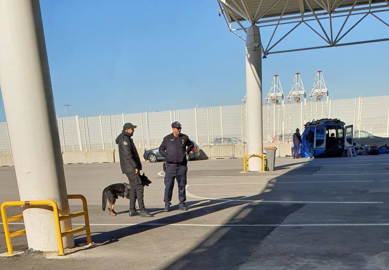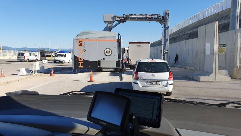 Op de kade rangeren we onze camper eerste onder een reuze scanapparaat. Aan het gezicht van de scan-operateur valt niets af te lezen als hij ons doorzwaait. Het volgende checkpoint is het echte werk. Talloze auto's worden aan de zijkant ontdaan van al hun bagage en dakspullen. Een agent met strak onbewogen gezicht vraagt paspoorten en kentekenbewijs op en politieagenten met aangelijnde snuffelhonden, zwarte herders, paraderen rond de camper.