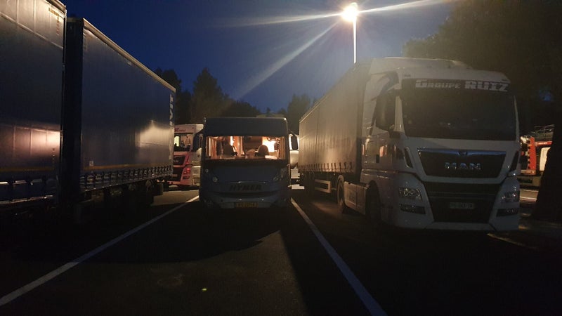 Aangekomen op de A9 beukt de vent lateral in toenemende mate op onze zijkant. Ter hoogte van Salses le Chateau, inmiddels 50 km p/u rijdend, wordt het volledig onverantwoord om verder te gaan. We duiken neer op een Aire en zoeken een enigszins luwe plek. Zeer tegen onze principes in, besluiten we hier de nacht maar door te brengen.