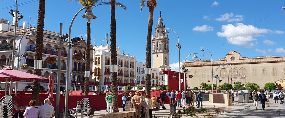 Via sluiproutes weten we geblokkeerde straten te omzeilen en bereiken we het Plaza Espana. Waar een grote menigte in afwachting is van de zondagsprocessie die straks langskomt. Het hele plein is daartoe gereed gemaakt. Een breed pad wordt geflankeerd door vakken met honderden gereserveerde stoelen. Camera's staan klaar, evenals politie die in grote getale alles in goede banen moet begeleiden. Eerst drinken we in een zijstraatje een kop koffie en horen al snel dat de optocht is begonnen. Op het plein is het knetterdruk.