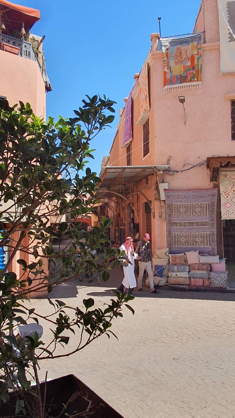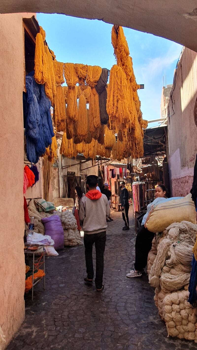 We nemen een taxi naar Koutoubia, waar we ons eerst op een terrasje nestelen voor een nos-nos. Onderwijl genietend van alle levendigheid en drukte van de stad, die zich voor onze neus afspeelt. C'est la vie! Na een sneaky preview in een luxe riad, lopen we via een smalle straat vol kraampjes richting centrum. We bewegen mee met de massa, intussen brommers, tuk-tukjes en ander rijdend spul ontwijkend. Op het Djemna El Fna is een groot gedeelte afgezet voor een heuse Ferrari happening. Het jankende geluid van zo'n 80 sportwagens heeft een magnetische werking op het massaal toegestroomde publiek. Via de sapkraampjes bereiken we de entree van de souk, waar we ons een aantal uur vermaken. Onder andere krijgen we een interessante uitleg over Marokkaanse tapijten in de grote tapijtenbazaar.