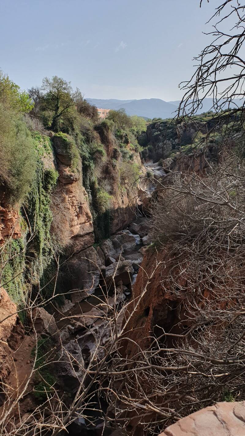 Via de outskirts van Marrakesh vinden we de binnenroute naar Demnate, een goede 100 kilometer verderop. Het merendeel van ons traject voert ons over een groene vruchtbare vlakte. Deze bevindt zich net ten noorden van het Atlasgebergte, van waaruit veel water wordt aangevoerd om de akkerbouw te irrigeren. In het gezellig aandoende stadje Demnate trekken we wat cash geld uit een ATM. De laatste paar kilometers brengt ons net buiten de stad bij een diepe kloof met een natuurlijke brug.