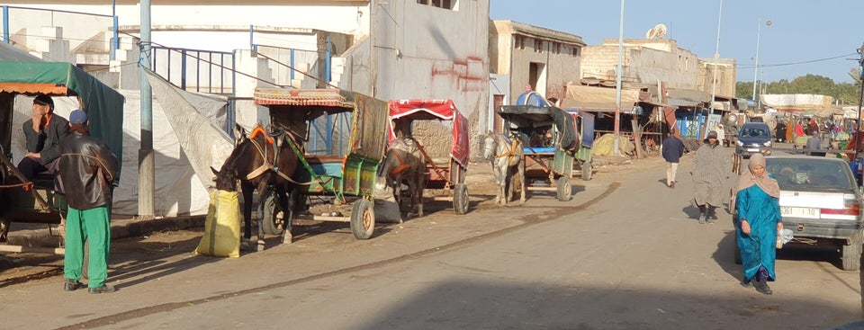 Als ik mijn hoofd uit de camper steek 'smorgens vroeg, zie ik dat we nog net niet zijn ingesloten door een groepsreis van Nederlanders, die al 7 weken door Marokko trekken. We zijn vertrekgereed als de jeugd met hun trolleys aankomen. In pakweg 5 minuten hebben we het centrum verlaten en bevinden we ons op de veel rustigere brede weg buiten de stadsmuren.