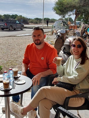 In de hoek bij Arrivals drinken we bij het barretje een nos-nos in afwachting van de vlucht uit Weeze. Die arriveert vlotjes, zelfs een kwartier eerder dan gepland. En het prettige van zo'n klein vliegveldje is dat de formaliteiten allemaal zo gepiept zijn. In notime staan Michelle en Jeroen voor onze neus en kunnen we knuffelen. Wat is het leuk om elkaar weer te zien. Gauw laden we hun spullen in en gaan eerst 10 kilometer verderop in Ghazoua op een buitenterras koffiedrinken.