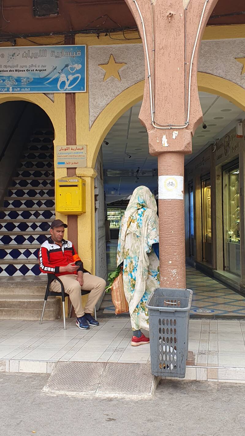 Na het ontbijt halen wij de muis uit de garage en gaan op weg naar Zaouit Aglou, het eigenlijke Marokkaanse dorp twee kilometer landinwaarts. Daar kopen we bij de pharmacie wat paracetamol, want die zijn op.