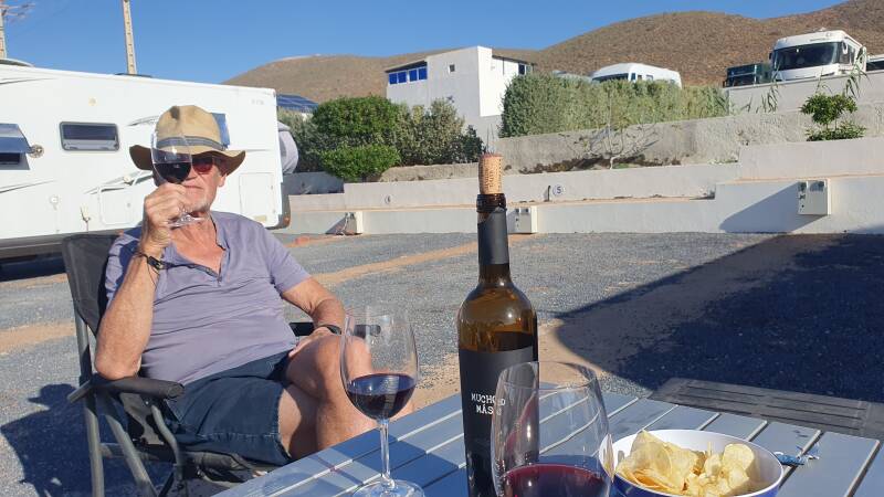 Wij lezen en dommelen wat. Aan het eind van de middag komen Kees en Trui erbij zitten en drinken we een mooi glas Mucho Mas Black label, waarvan we een doosje hebben meegenomen van huis, heerlijk.