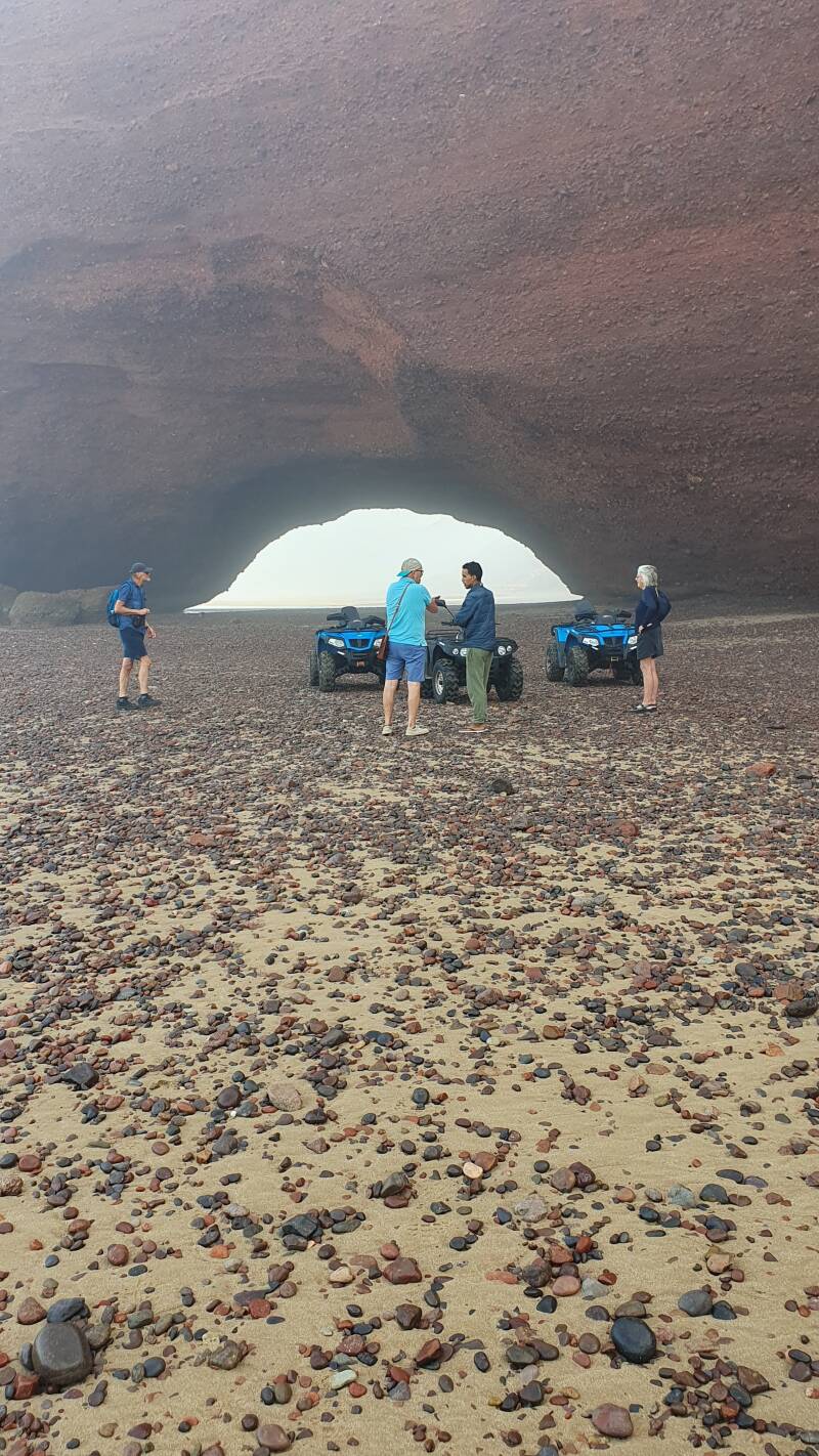 Er ligt er nog één een stuk verderop, maar daarvoor moeten we 100MAD per quad extra dokken. We gaan akkoord. Over lege stranden bereiken we uiteindelijk de grootste boog, prachtig! We lopen korte tijd rond en genieten van de mooie setting. De vloed komt hier al weer opzetten, dus moeten we terug. Heerlijk om ons af en toe wat af te laten zakken en weer naar de twee quads voor ons te scheuren op het lege strand 🤗. Terug bij ons startpunt doen we op het strand een nos-nosje, alvorens met de camper omhoog te rijden.