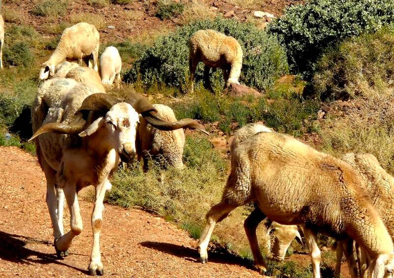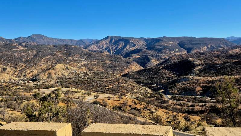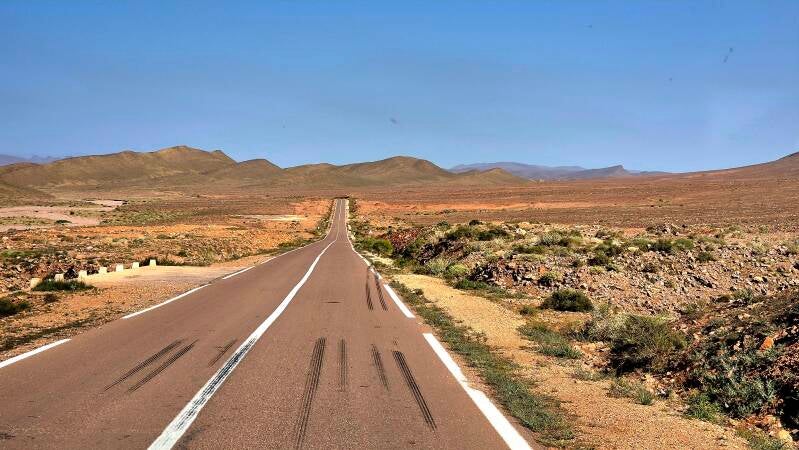We laten de safraanteelt achter ons en de N10 kronkelt steeds verder omhoog met soms haarspeld-gedeelten die het bergmassief moeten overwinnen. De omgeving wordt ook steeds woester en droger en bewoning wordt schaarser. Uiteindelijk toppen we een col, waarvan we de naam niet kennen met een respectabele hoogte van 1841 meter. We cruisen een hoogvlakte op, waar de grote hoeveelheid neerslag van drie maanden geleden zijn sporen heeft nagelaten. Soms zien we in de uitgesleten geulen nog wat water staan, tussen het gesteente wat eerder uit de bergen is meegevoerd. Bovendien ligt er soms een groenige gloed over de rotsbodem en zijn bij schaarse hutjes aangelegde watervoorraden tot de rand toe gevuld.