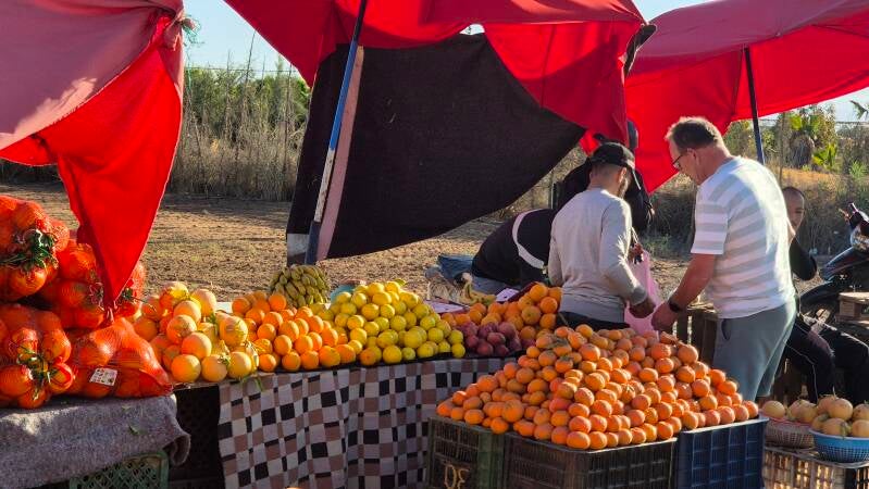 Als de boel weer blinkt en we de lunch hebben geconsumeerd, wordt de Muis uit haar hok getrokken en eenmaal daarop gesetteld tuffen we naar Agdz. Onveranderlijk, onopvallend en weinig enerverend is mijns inziens een passende omschrijving van dit stadje. Desondanks weten we de kleine markt nog feilloos te vinden en worden onmiddellijk aangehaakt door naar kopers smachtende handelaren, begrijpelijk gezien de stilte van de middag. We lopen even rond en bekijken de uitstalling van GBR en wuiven vervolgens kalmpjes alle aankoop smeekbedes weg.