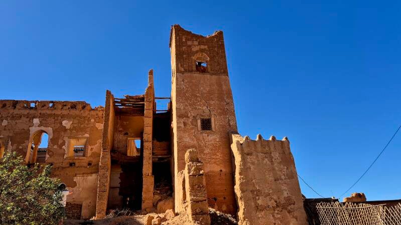 Na de lunch halen we de scooter ut de garage en rijden eerst naar de prominent aanwezige kasbah-ruine. Het ooit zo prachtige lemen paleis valt na 70 jaar steeds verder in puin. Dat heeft alles te maken met de laatste eigenaar de verbannen Pasja Thami El Glaoui, ooit de machtigste man van Marokko. Door zijn ultieme verraad aan het koningshuis in de 50-er jaren van de vorige eeuw werden al zijn bezittingen geconfiskeerd (zie ook Marokko 2023 deel 7 - zaterdag 11 maart ) en laat men doelbewust al zijn paleizen door de tand des tijds afbrokkelen. We kunnen niet echt in het pand, het is dichtgetimmerd en de fragiele staat maakt het te gevaarlijk om te betreden.