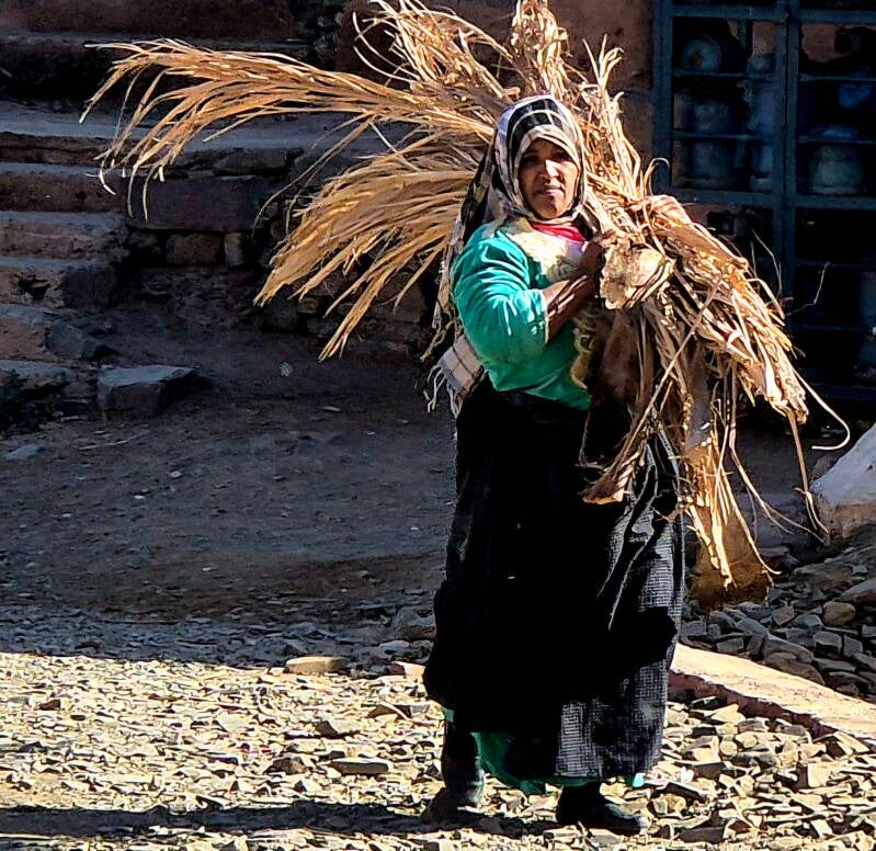 Aan de overzijde wandelen we het gehuchtje in en net om de hoek van de hoofdstraat botsen we op een winkeltje met aan rekken wapperende kledij. Onderuitgezakt en ogenschijnlijk ongeïnteresseerd, scannen de ogen onder de tulband van de op een stoeltje gezeten verkoper continue rond of er zich een nietsvermoedend slachtoffer (eigenlijk een toerist) aandient waarop hij zijn verkoop-skills kan botvieren. Als ik hem passeer, zou ik hem voor kunnen zijn door met mijn hand op mijn hart non merci, shukran, alhamdullilah direkt zijn tactiek in de grond te boren. En vermoedelijk zal hij dan zijn al geheven arm laten zakken en zuchtend weer vervallen in een ogenschijnlijke lethargie. Maar dat gebeurt niet, hij lacht en verwelkomt mij met 'allemachtig prachtig' en als ik beantwoord met 'allemachtig mazyan' wordt zijn glimlach nog breder. Wij hebben elkaar gisteren al gesproken en omdat ik het Marokkaanse woord voor prachtig kende, mazyan', was het ijs tussen ons snel gebroken, leuk. En zijn geheugen werkt optimaal als ik na onze begroetingsrituelen weer wegloop met 'allemachtig prachtig, mijn kameel is drachtig' , hij riposteert met 'dromedaire' en het gebaar van een bolle buik maakt 😄.