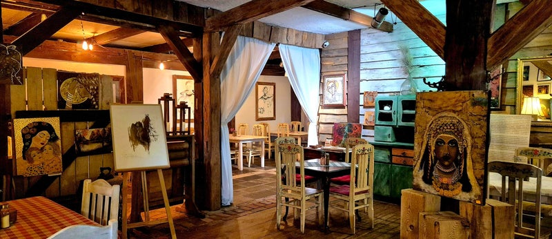 Na gelukkig slechts een paar door de Navi geforceerde kilometers over de snelweg lunchen we langs de binnenroute in het rustieke mooi aangeklede restaurant Austeria. Marjos kiest voor de Babka Zemniaczana, aardappelcake met paddestoelensaus en ik voor Pierogi Swarkami, dumplings gevuld met aardappelen, kwark en bestrooid met gebakken ui en bacon.