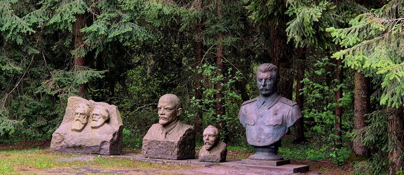 Zo staat daar onder andere het fiere beeld van de Litouwse socialiste Marija Melnikaite. Ze strekt haar linkerarm met open hand schuin naar voren, haar gelaarsde rechterbeen geheven in een stap voorwaarts. Marija weet waar ze heen wil, naar een ideale socialistische toekomst. En zij nodigt iedereen uit haar te volgen. Voorwaarts gaat ze met wapperende haren. Bijna nonchelant houdt ze daarbij een geweer vast met de loop naar beneden gericht. Ook haar beeltenis sneuvelde in het de-russificatie proces na de omwenteling naar democratie en onafhankelijkheid. Wandelend komen we langs wel twaalf Lenins, altijd gekleed met gilet, twee vaderlijke Stalins, even zoveel Dzerzjinksi's, één Marx en vijfmaal de Litouwse socialistische voorman Vincas Kapsukas. Maar ook staan daar beeldgroepen van ernstig kijkende mensen die zich achter een wapperende banier hebben geschaard. Of een brokstuk van een gehelmd hoofd, duidelijk een held, die door een lichte groene algaanslag qua kleur vervloeit met het stukje bos waarin hij ten ruste is gelegd.