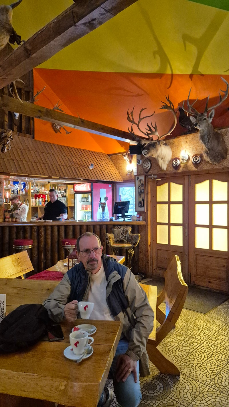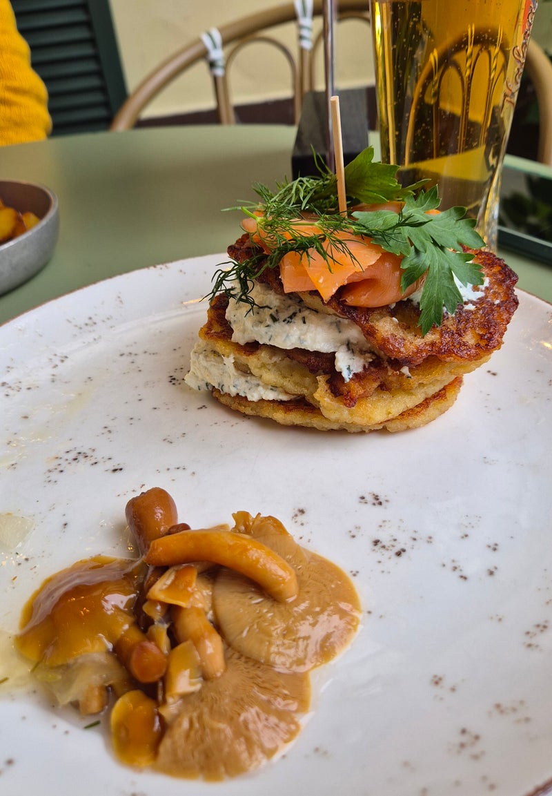 Rechtsomkeert en heuveltje-af, het glooit kalmpjes neerwaarts 🙂, zetten we ons bijna vooraan op de Pilies, neer op het terras van een restaurant die Litouwse gerechten serveert. We delen zalige koude bietensoep en een gerecht met aardappelpannekoekjes, zalm, zure room, dille en paddestoelen, heerlijk 😋.