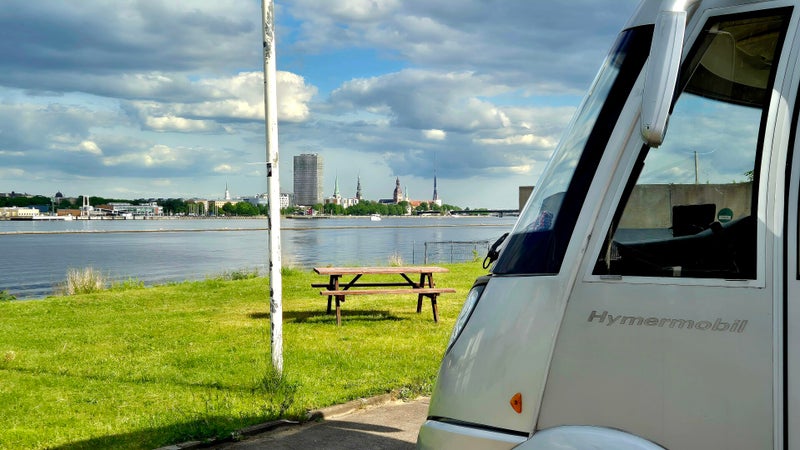 De CP van de jachthaven op het eiland Kipsala biedt fraaie plekken aan de waterkant van de Daugava. Rechts aan de overzijde van deze rivier is het silhouet van de oude stad van Riga met zijn kerktorens mooi zichtbaar. De beheerder van de CP komt de eerste nacht innen en geeft ons veel informatie ondermeer over hoe we de stad kunnen bereiken vanaf deze plek.