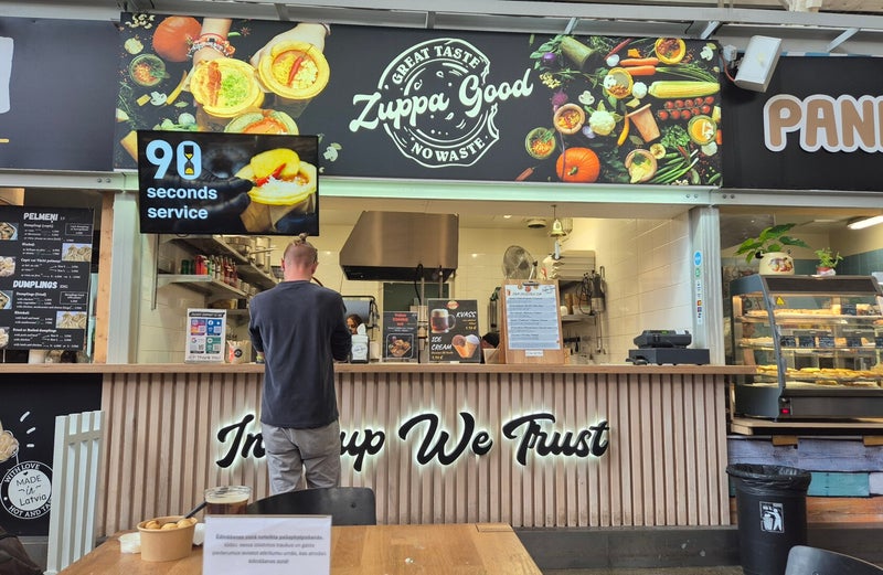 Elk van deze hallen heeft zijn eigen thema, vis, vlees, groenten, kleding, levensmiddelen en streetfood. Bij de laatste, in een van die eettentjes 'Zuppa Good - In soup we trust' bestellen we een soep. Die wordt in eetbare bekers geserveerd, Marjos de Borjscht en ik de Chiliconcarne, beiden heerlijk.