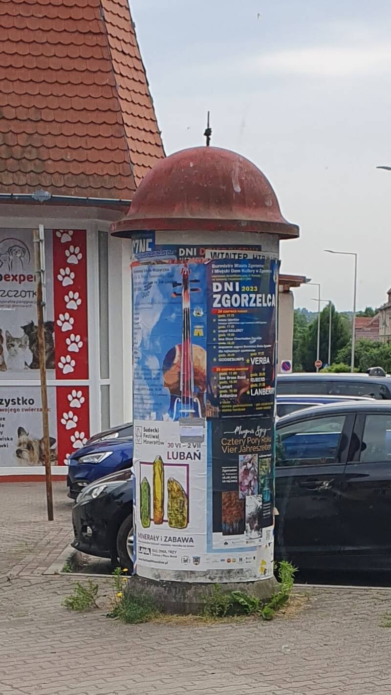 Na Wróclaw proberen we nogmaals een binnenroute en nu gaat het goed. Overigens zien we later, dat het precies goed gaat met ons E-toll tegoed, er resteert PLN 1,54 (!) 😄. We passeren wat dorpjes en stadjes. Vaak staan daar ook nog nostalgische 60-er jaren reclamezuilen, die bij ons allang verdwenen zijn. En stuiten we op de nodige heiligenbeelden en kruizen, die met veel versieringen de religieuze beleving van het platteland onderstrepen.