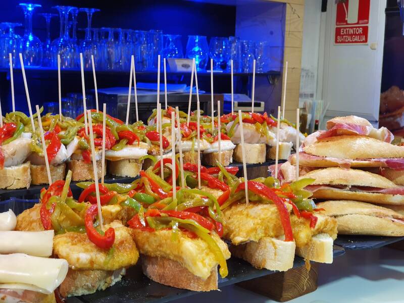 In een etablissement aan de haven, waar we een café con leche drinken, trekken de uitgestalde pintxos onze blik en we bestellen er wat. Deze doen niet onder voor die in Donostia, verrukkelijk.